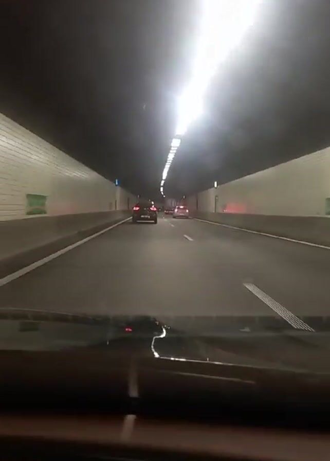 The view from inside a moving car shows driving through a tunnel