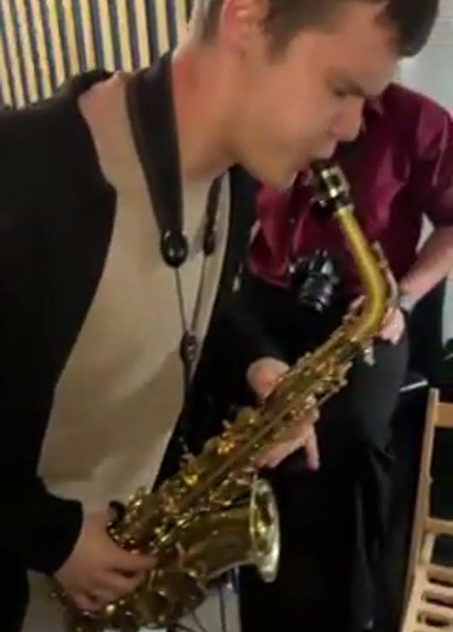young man playing a saxophone. He is wearing a beige shirt, a black cardigan, light blue jeans, and a black strap for the saxophone. He is standing and focused on playing. Behind him, another man is sitting. He's wearing a red shirt, black pants, and a black beanie. A camera is around his neck. He appears to be watching the saxophonist. The setting looks like an indoor event space or studio. A wooden structure is visible in the background.