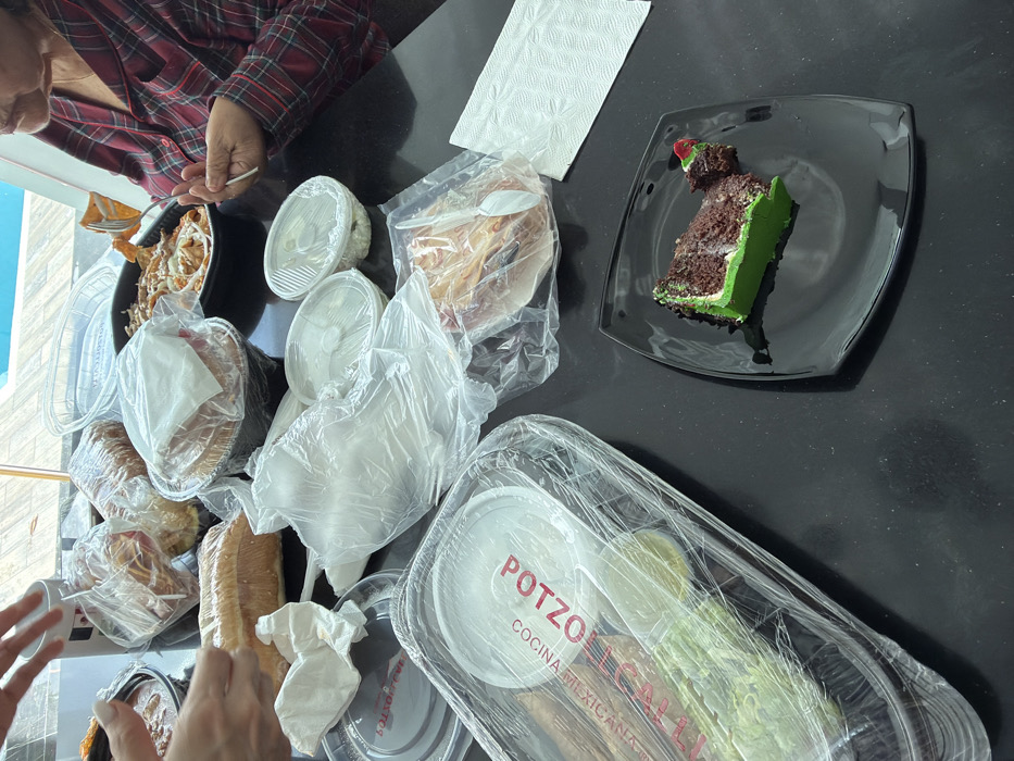 A black table is covered with various food containers, many wrapped in plastic. These include items from "Potzoll", possibly a Mexican dish. A partial slice of green-frosted chocolate cake sits on a square black plate, accompanied by a white napkin. A person in a red and black plaid shirt is visible on the left, eating from a dish with a fork. Another person's hands are visible at the bottom, near a loaf of bread. The overall scene suggests a casual meal or takeout situation.