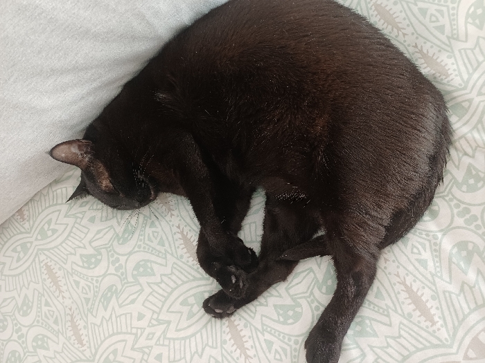 - "A single black domestic cat is depicted resting on a bed" by FM-wxsQB3, licensed under CC BY 4.0