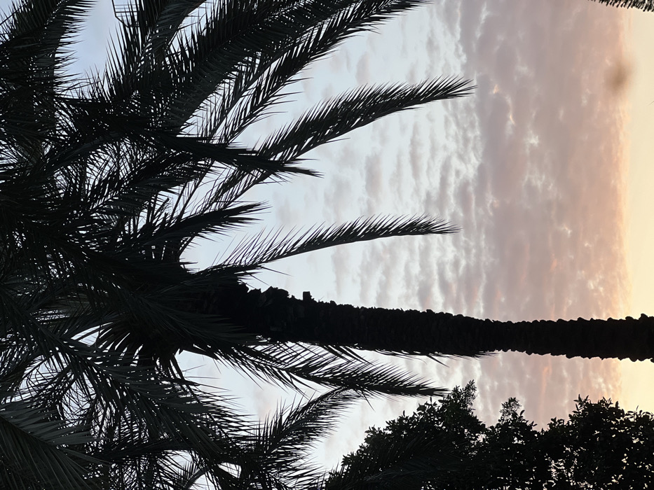 The scene depicts an outdoor environment in Kiryat Motzkin, Israel, captured during either sunrise or sunset. A large palm tree, rendered in dark silhouette, occupies the central and right portions of the frame, with its textured trunk extending vertically and its fronds fanning out across the upper area and to the right. A smaller, dark-silhouetted tree or dense bush is partially visible along the left edge of the image. The sky behind the trees presents a gradient of colors: light blue at the top, transitioning through white and pinkish-orange in the mid-section, and settling into a warm orange-yellow hue at the bottom. Numerous small, scattered cloud formations are present in the sky, particularly in the pink-orange region. No individuals, structures, or specific actions are discernible within the frame.