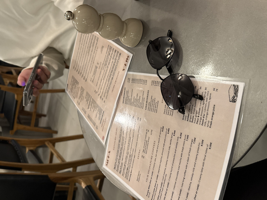 The image captures a close-up, slightly overhead view of a gray cafe table within a MOKA cafe in Paris, France