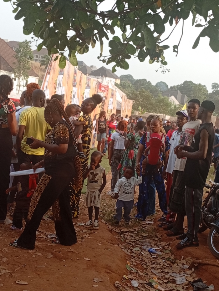 A crowd of people gathers outdoors, many holding children
