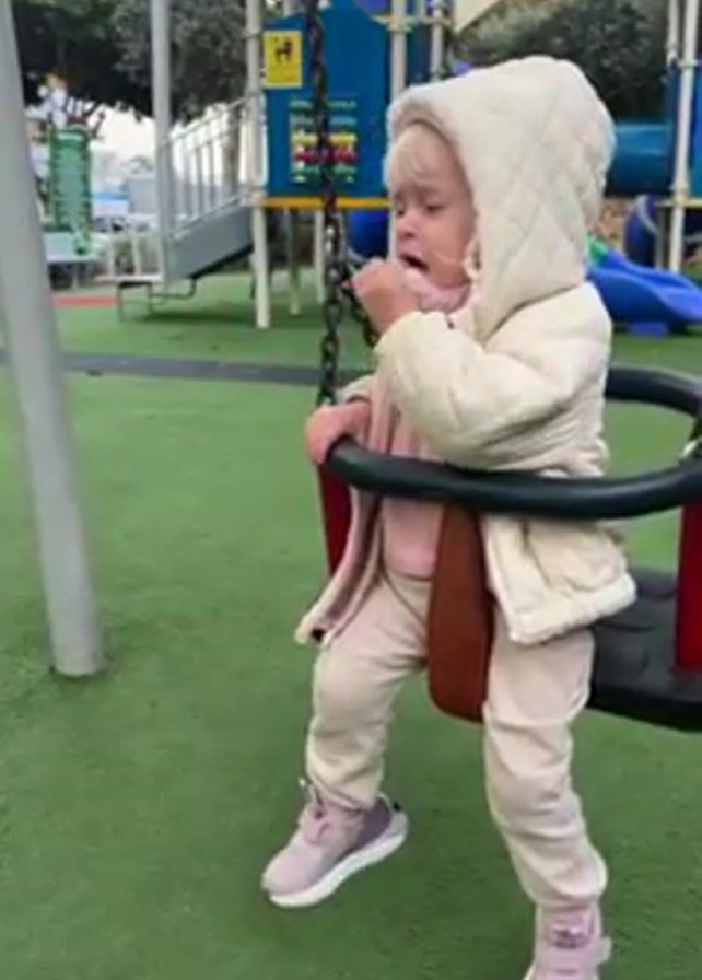 A toddler with blonde hair wearing a light-colored quilted coat, a pink turtleneck, light-colored pants, and pink sneakers sits on a red and black swing at a playground