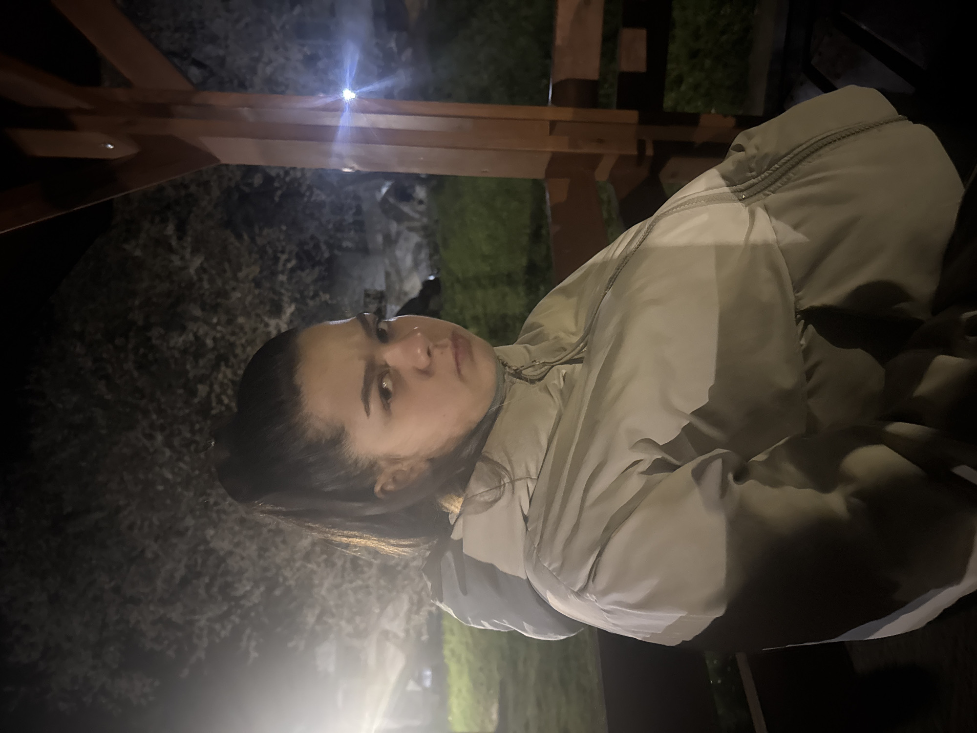 A woman with dark hair and an olive complexion is visible in the image, wearing a light-colored, quilted jacket. She is situated outdoors, likely at night, judging by the low lighting conditions. The background features a wooden structure, possibly a pergola or shelter, with foliage visible in the periphery. The location appears to be Dryanovo, Bulgaria, based on the presence of typical architectural features and environment found in the area. The scene seems casual, possibly a gathering or outdoor relaxation.
