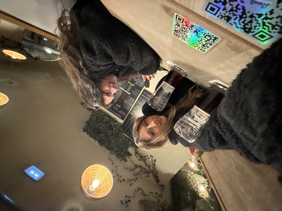 Two women pose at a restaurant table, each holding a large beverage. One woman has long brown hair and wears a dark furry jacket. The other woman has lighter brown hair and also wears a dark furry jacket. A menu is visible behind them. On the table are a couple of QR codes and stickers. Decorative lights and plants provide a warm ambiance. The image is taken at an unusual angle, possibly from above.