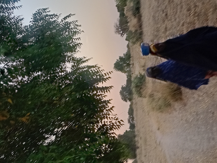 The image is a landscape with a mix of greenery and open fields. A large tree with dense foliage occupies the left side of the frame. The right side transitions to a dry, grassy field dotted with sparse trees in the distance. It appears to be a windy day with objects on the right side of the image slightly blurred. A blue bottle top is also visible. The sky is pale and suggests either early morning or late afternoon.