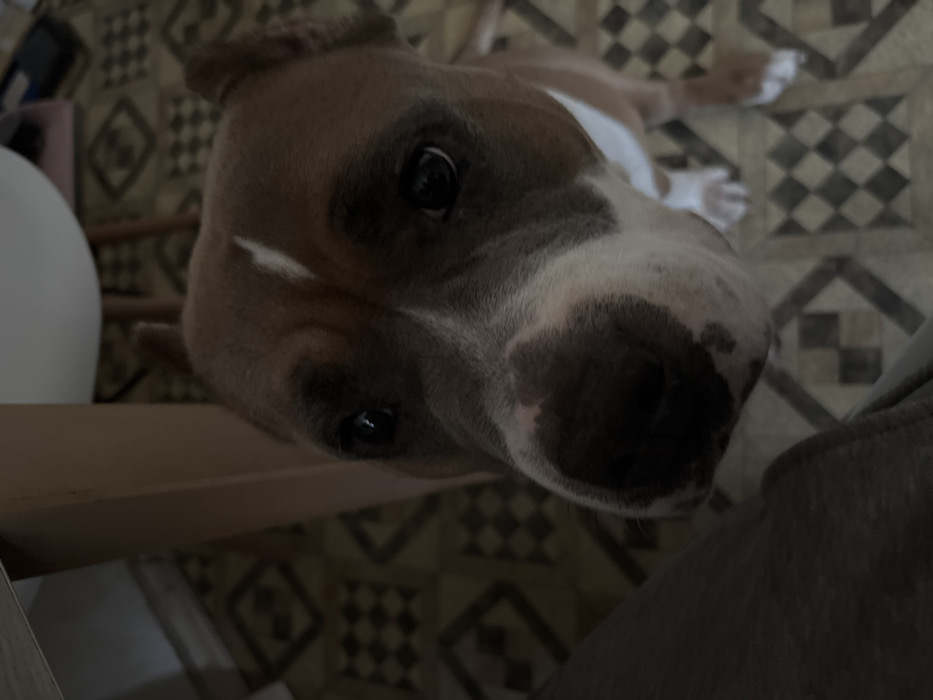 - "The image depicts a tan and white American Staffordshire Terrier, or similar bully breed, positioned indoors on a patterned floor" by FM-spN8D2, licensed under CC BY 4.0