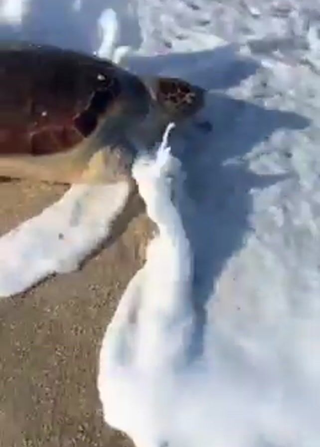 sea turtle lying on a sandy beach with waves washing over it. The turtle is mostly lying on its side, and the waves are white and foamy as they come in and retreat. The sand appears to be light brown or gray. The turtle appears to be an adult specimen, with a large shell. It's mostly still, though the water may be moving it around somewhat.