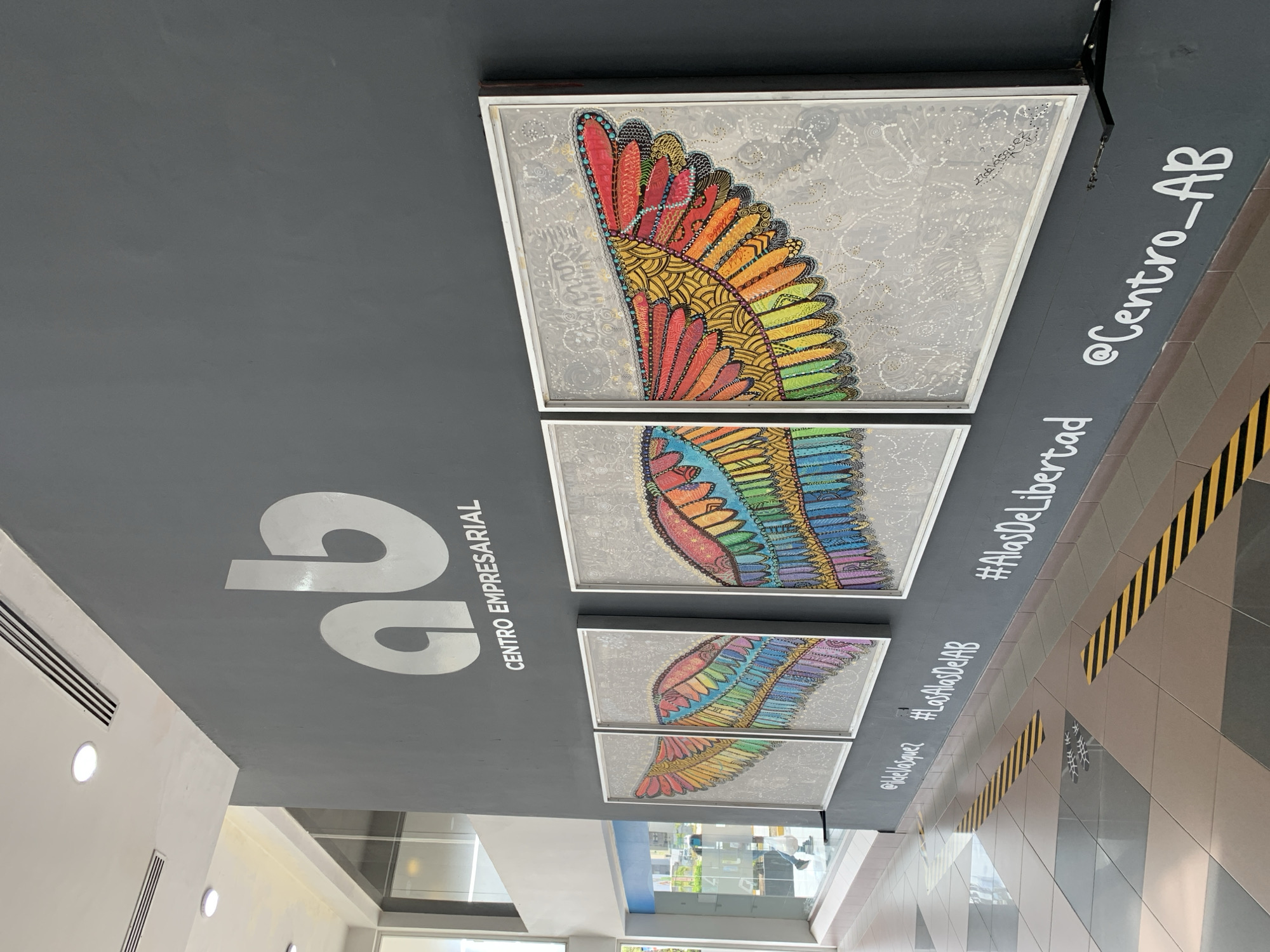 The image depicts the interior of a building, potentially a commercial or public space in Pampatar, Venezuela. A gray wall with the logo "ab CENTRO EMPRESARIAL" and three framed artworks displaying colorful wing motifs are visible. The wings appear to be rendered in a detailed, illustrative style with a rainbow color palette. The wall also features social media handles and hashtags "@Centro_AB" "#AlasDeLibertad" and "@Nellyasquez #LasAlasDeLAB." The floor has a tiled pattern, with yellow and black hazard stripes painted on it. The lighting suggests an indoor environment with artificial light sources. Through a glass window, the exterior of the building is visible, showing a glimpse of trees and sky, indicating a daytime setting. No people are visible in the immediate foreground, but a person is faintly visible through the glass window in the background.