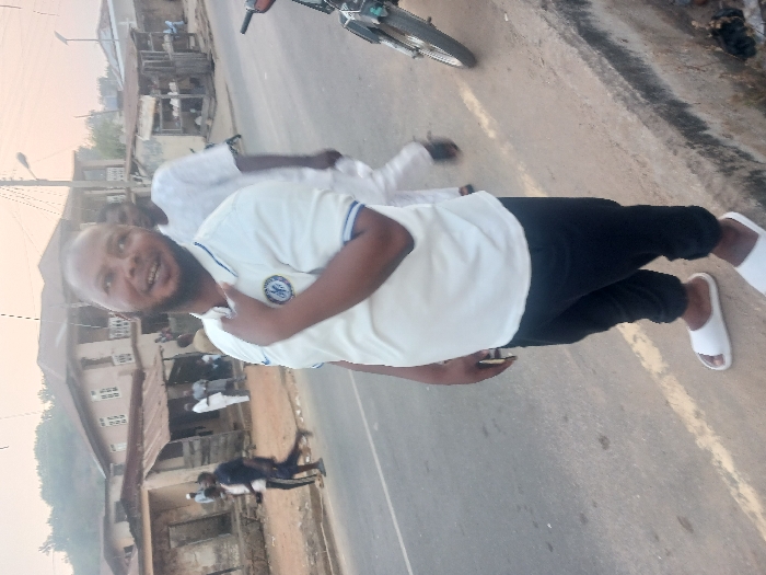 A smiling man with a beard stands on a road wearing a white shirt, black pants, and white sandals. He is partially obstructed by another person in white traditional wear. A motorcycle is visible in the background. Buildings and utility poles line the road, suggesting an urban or semi-urban environment. The image is taken at an oblique angle, making the horizon appear tilted. The lighting suggests either early morning or late afternoon.