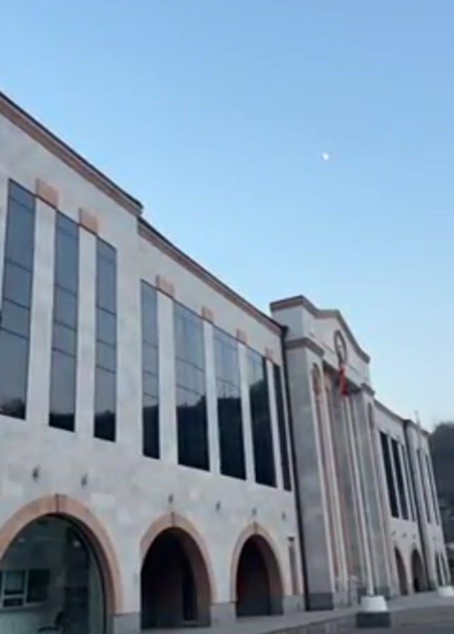 low-angle view of a long, two-story building under a clear, blue sky with a sliver of a moon visible. The building is constructed of light-colored stone with dark window panes. It has arched entryways on the ground floor. A bas-relief sculpture depicting people and a tree is affixed to the building's facade. A flag hangs from a flagpole near the building's edge. A paved area extends in front of the building.