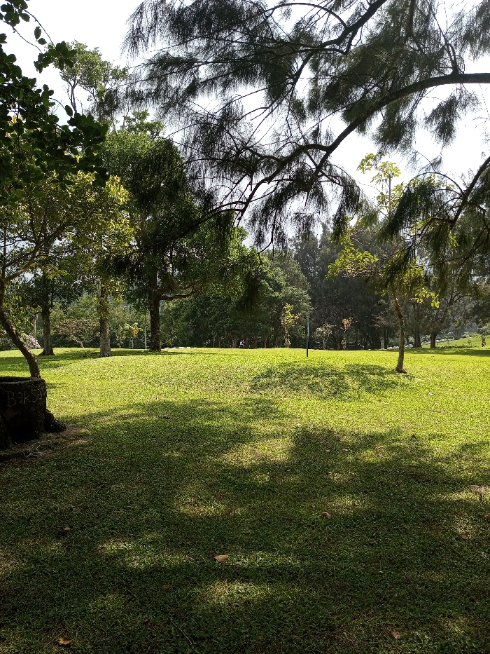 A sun-drenched green lawn stretches across the scene, dappled with shadows cast by overhanging trees. A dense collection of trees borders the back of the lawn, some with sparse foliage and others appearing fuller. In the lower left corner sits a dark object with the word "Bakso" etched onto it. The branches of a large tree frame the top of the image, creating an enclosed, natural setting.
