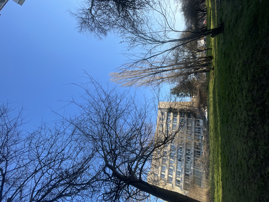 The image displays an outdoor scene in Sofia, Bulgaria, characterized by a clear, bright blue sky overhead. In the foreground and midground, a largely dormant grassy area is visible, interspersed with patches of green and dry brown vegetation. Numerous bare deciduous trees are prominent; a large tree with a thick trunk and extensive branching occupies the left foreground, while several tall, slender trees stand in the central midground. To the left, a multi-story concrete building with numerous rectangular windows, some equipped with external air conditioning units, is partially obscured by the trees. A white sedan is partially discernible on the ground level behind the trees, in front of the building. The scene is illuminated by direct sunlight. No individuals are visible, and no specific actions or interactions are observed.