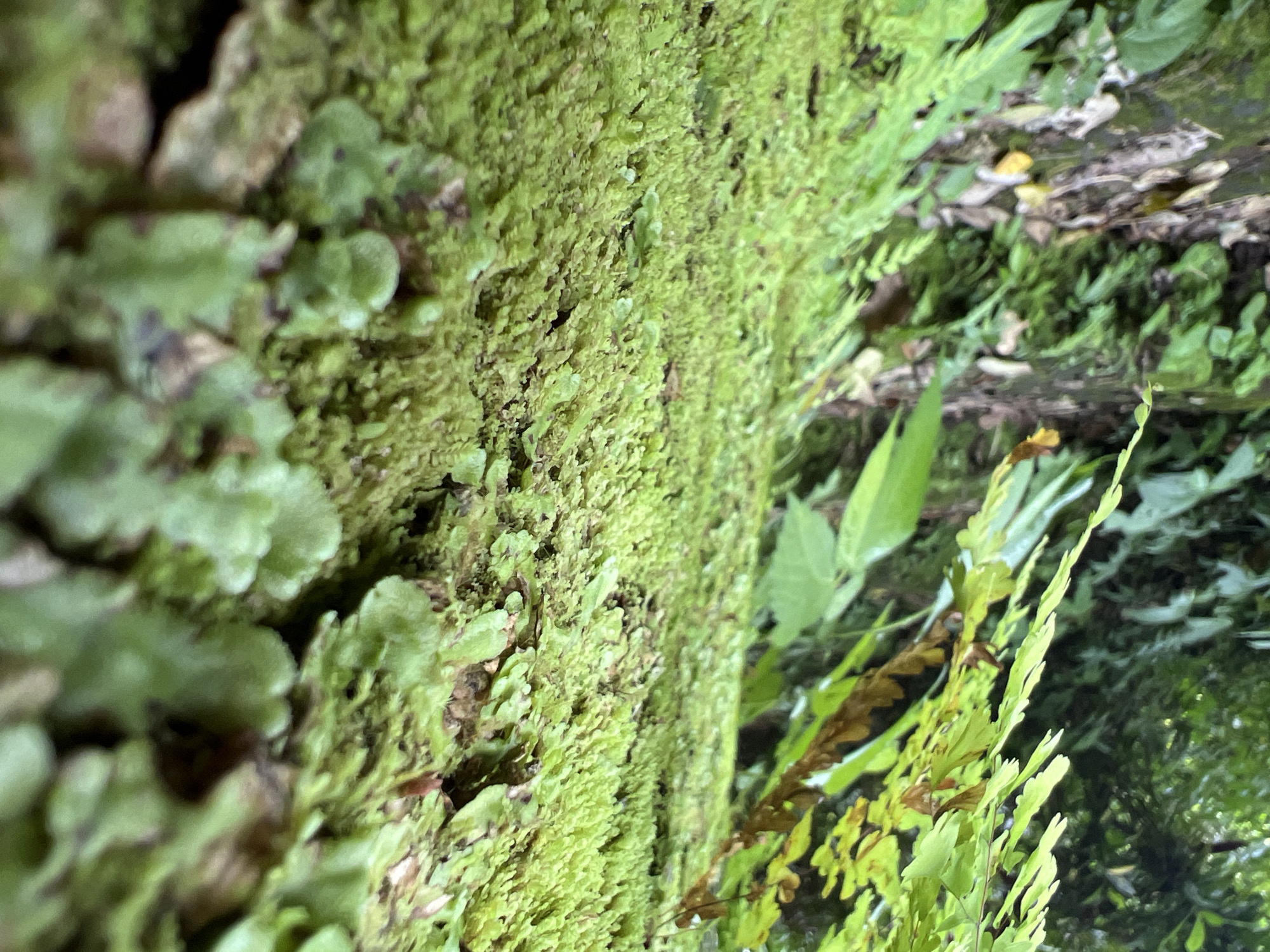 The image presents a close-up view of a tree trunk or rock surface densely covered with various types of green vegetation, including mosses and leafy plants