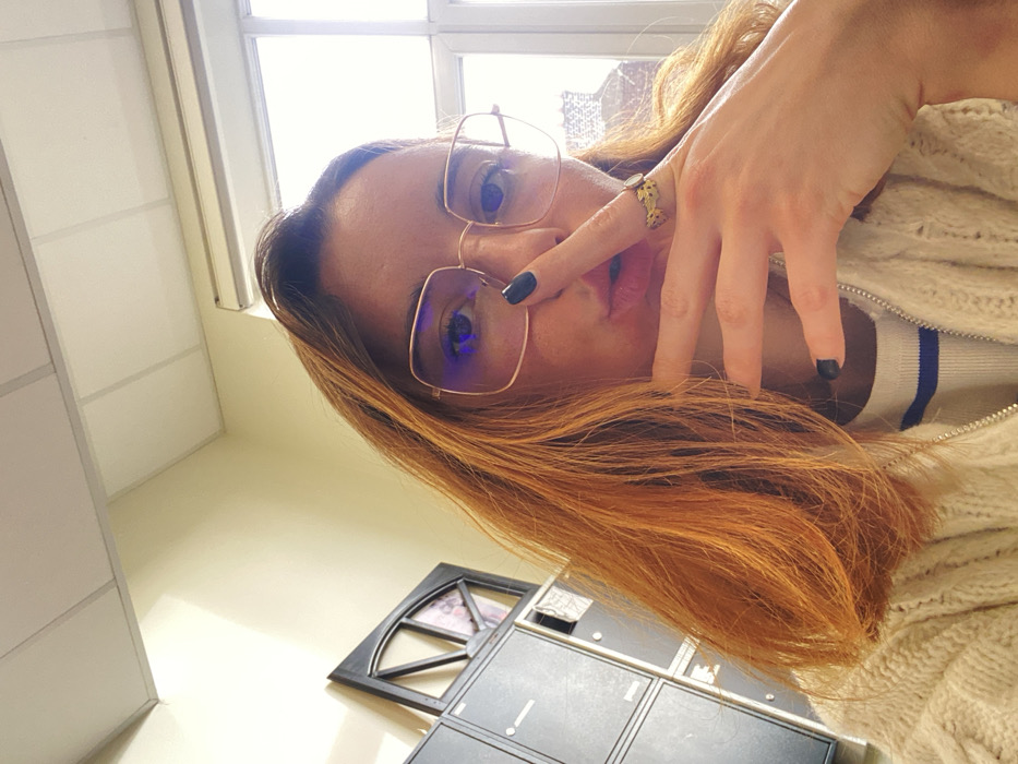 A single individual, an adult female, is depicted in a close-up, high-angle selfie from the chest up. She possesses long, reddish-brown hair, styled loosely, which partially obscures the left side of her face. She wears large, square, light-framed eyeglasses, with a distinct blue light reflection visible in the left lens. Her right eye is clearly visible; the left eye is partially obscured by glare and hair. Her lips are pursed and slightly open, suggesting an action like blowing a kiss or a "shush" gesture. Her right index finger, adorned with a dark blue/black painted nail, is positioned vertically, touching the bridge of her nose and upper lip. A gold-toned ring with a leaf or intricate pattern is worn on her right ring finger. She is dressed in a cream-colored, cable-knit, zippered cardigan over a white top with horizontal blue stripes. A thin silver chain is visible around her neck. The environment is an indoor setting with light-colored walls and a white drop ceiling featuring acoustical tiles. To the left of the subject, a stack of grey metal lockers, at least four high, is visible. Adjacent to the lockers, a dark, arched, multi-paneled decorative object or framework leans against the wall. To the right, a large window admits substantial natural light, revealing parts of reddish-brown brick buildings with visible rooftops, indicative of an urban environment. A white rectangular air conditioning or ventilation unit is mounted on the wall above the window frame on the right side. The image does not contain sufficient specific visual information to precisely identify a particular location within the city of Lille, France. The depicted interior appears to be a generic office, school, or institutional space.