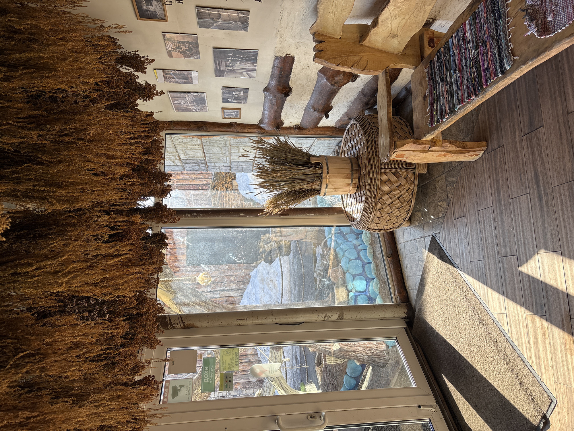This image captures the interior of a rustic-style room or waiting area located in Bely Klyuch, Russia. The ceiling is densely covered with dried, light brown, fibrous plant material, creating a textured canopy. Large glass doors and windows dominate the left and center of the frame, providing a view of an outdoor winter environment with snow-covered ground, wooden structures, and decorative blue stones. A light bulb on a rope is visible hanging outside the window. Stickers on the glass door include the word "ВХОД" (Entrance) in Russian, a CCTV camera icon, and various payment system logos. The floor consists of light brown and darker wood-look tiles, with a rectangular, light brown doormat positioned near the entrance. Sunlight enters through the windows, casting distinct shadows across the floor. The right wall is light beige and decorated with multiple unframed and framed black-and-white photographs depicting historical or rural scenes. Below these images, two rough-hewn log sections are mounted horizontally on the wall. In the foreground to the right, a sturdy, light-colored wooden bench with a carved, rustic design is present. A colorful, striped rag rug is placed on its seat. Centered near the window, a woven wicker cylindrical pedestal supports a small wooden bucket filled with dried wheat stalks. No individuals are present in the scene, and no overt actions or interactions are depicted.