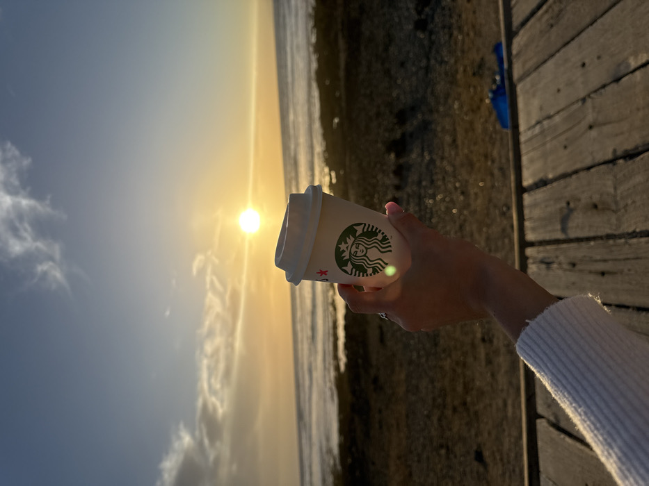 A woman holds a Starbucks coffee cup against a scenic backdrop. The sun shines brightly over the water. To the right, a wooden boardwalk runs parallel to the scene. The beach and ocean extend into the distance under a sunny sky with clouds.