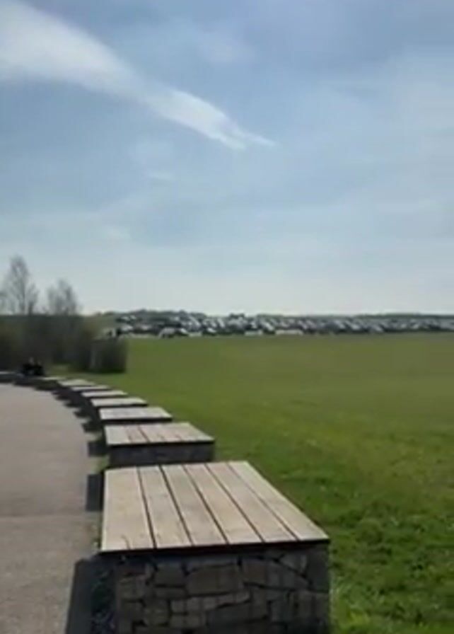 large parking lot full of cars in the distance, viewed from a slight elevation. In the foreground, there is a path with several square stone and wood benches. To the right of the path is a large grassy field that leads to the parking lot. The sky is blue with some scattered clouds. There are people walking on the path, but they are small and distant. The scene appears to be outdoors on a sunny day.