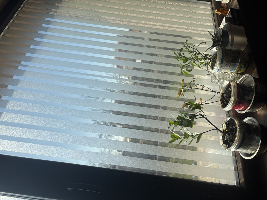 The image displays an interior view looking outwards through a window in Unknown, Unknown. The window features dark-colored framing and is equipped with translucent, vertically oriented blinds composed of numerous white, granular-textured slats. Strong sunlight streams through the blinds, casting light into the room and partially obscuring the outdoor view. On the dark wooden windowsill, five potted plants are arranged. From left to right: a plant with green foliage in a repurposed white plastic container, itself seated in a silver metal bowl; a plant with sparser, yellowish-green leaves in a repurposed plastic container with red markings, also in a silver metal bowl; a plant with small green leaves in a repurposed white plastic container with blue and yellow markings, resting in a white plastic bowl; a succulent in a dark grey pot placed within a white rectangular plastic container; and a small, dark amber glass bottle. A clear, patterned glass object is positioned between the second and third plants from the left. A dark rectangular object is partially visible behind the succulent. Beyond the window and through the vertical blinds, a daytime exterior scene is visible. Bare deciduous trees are present, suggesting a winter or early spring season. Faint outlines of distant buildings, including one with a reddish roof, are discernible against a clear blue sky. No individuals or active interactions are observed.