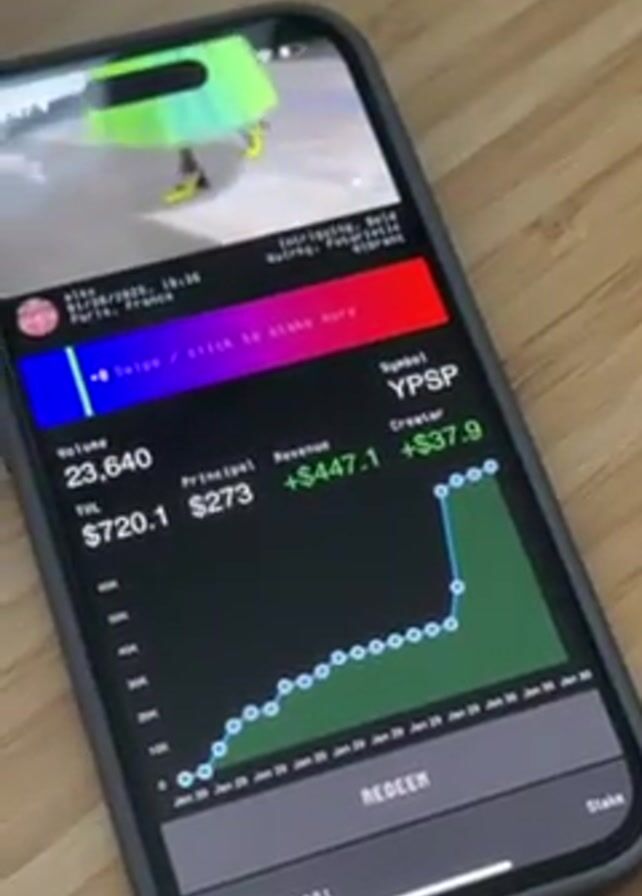 A cellphone displays an app showing a fashion video along with a financial dashboard. The dashboard displays data including Volume, TVL, Principal, Revenue, and Creator. The numbers are fluctuating, generally increasing. A finger with black nail polish touches the screen near the graph on the financial dashboard. The cellphone is on a wooden surface.