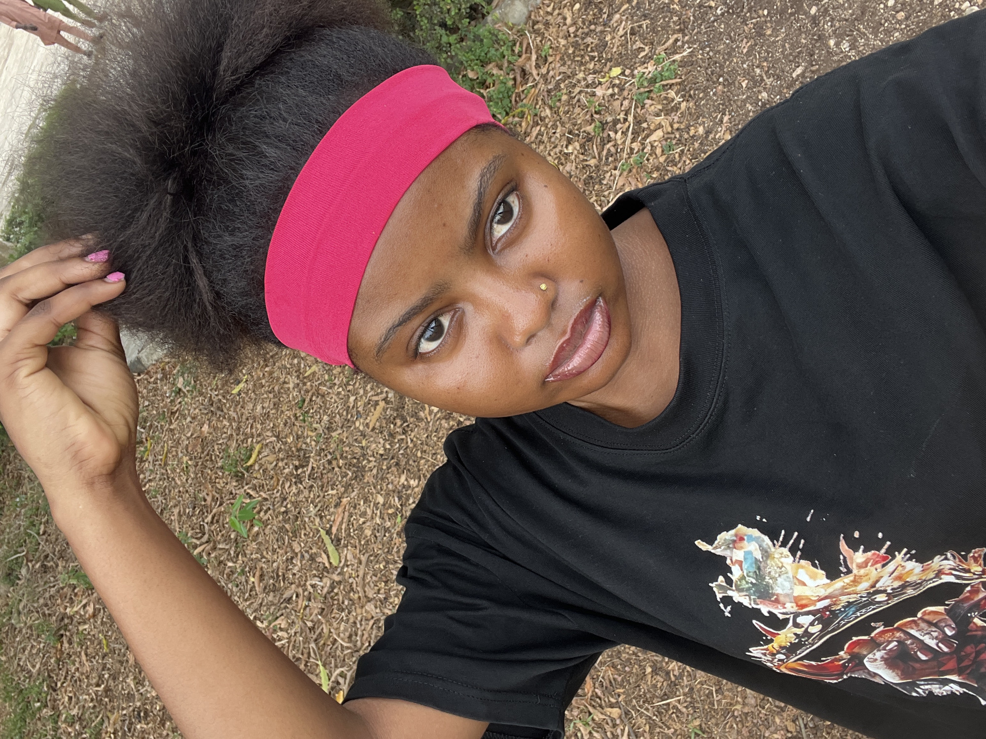 A young female is depicted in a close-up, selfie-style outdoor portrait in Ipetumodu, Nigeria. She has a medium-dark complexion and looks directly at the camera with her head slightly tilted forward. Her dark, textured hair is pulled into a high puff and secured by a bright pink fabric headband. Her right hand is raised, with fingers lightly touching her hair near the crown; the fingernails are painted with a pink, textured polish. She wears a black long-sleeved shirt featuring a multi-colored graphic design on the left chest, appearing to be abstract shapes. Her facial features include brown eyes, full lips with a glossy brownish-pink product, and a small gold-colored stud piercing the left nostril. The background primarily consists of ground covered with dry brown leaves and scattered small green plants.