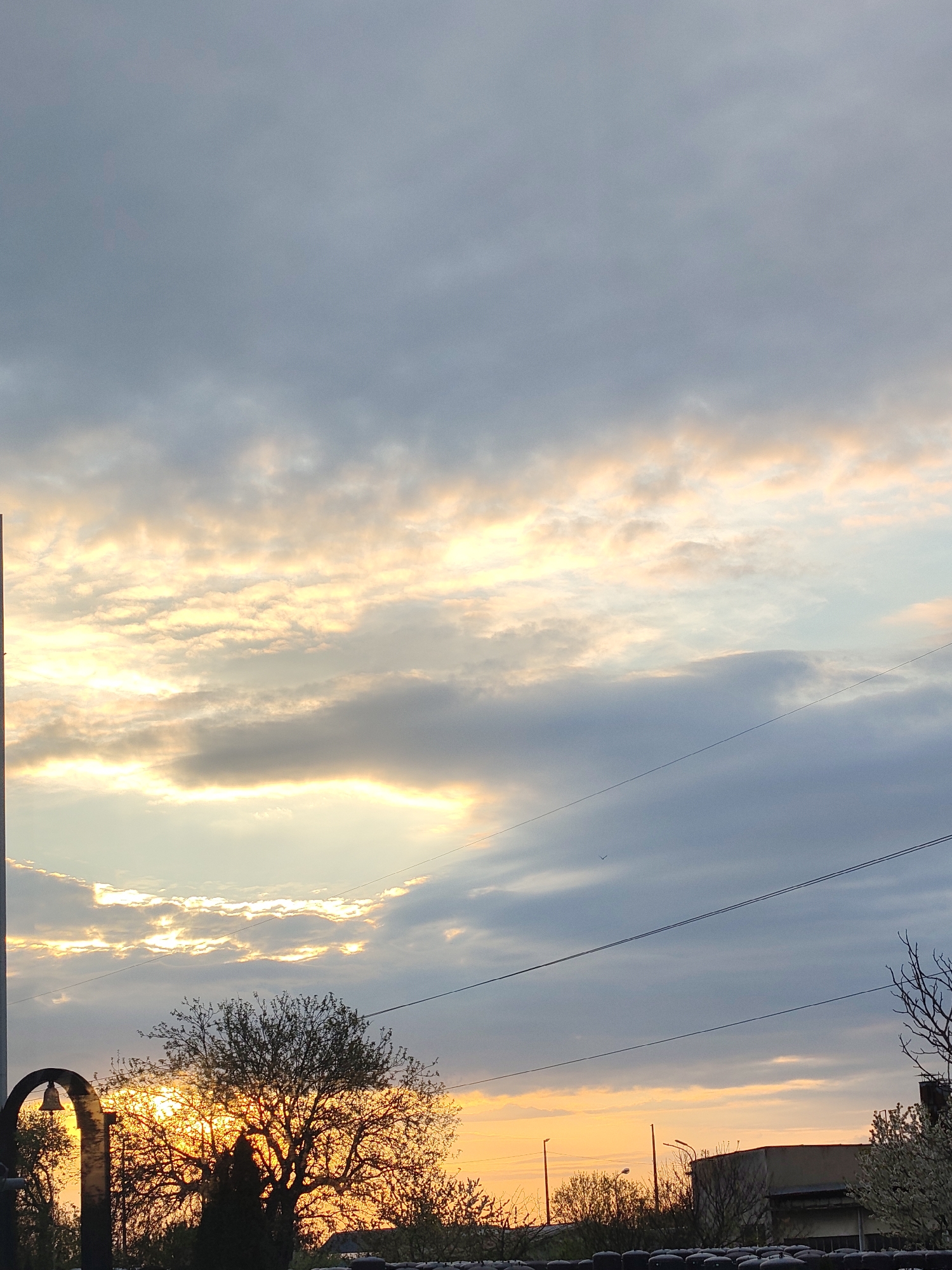 The image captures a sunset over Shumen, Bulgaria. Predominantly, the sky is filled with a mix of gray and orange-hued clouds. A tree is silhouetted against the setting sun, which is visible through its branches. Power lines cut across the sky. In the lower portion of the image, there is a building and a line of trees. The location appears to be urban due to the presence of buildings and power lines. A light post is near the right side of the image. A lamppost is near the left side of the image. A small bird is visible in the sky.