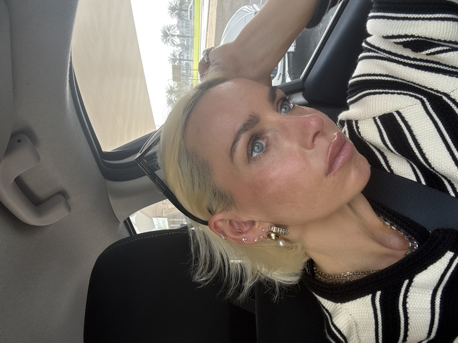 A light-haired woman with blue eyes is angled in the frame, seemingly seated in a car with the door ajar. She has a black and white striped sweater, multiple ear piercings, and a gold chain necklace. Her right hand rests on her head. Palm trees and buildings can be seen through the car window. Sunglasses are tucked behind her ear. She has a serious expression on her face.