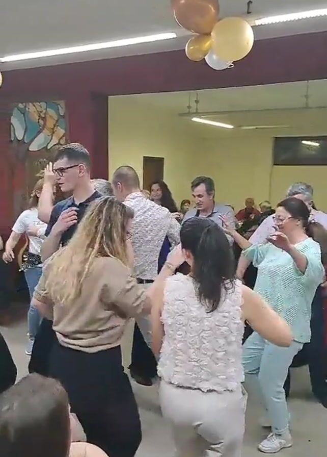 A medium shot captures a group of people dancing in what appears to be a large room or hall. The room is decorated with a maroon wall on the left and light-colored walls elsewhere. Several balloons, colored gold, yellow, and white, hang from the ceiling. There is a partial view of a painting or mural on the left wall. A mirror on the back wall reflects the dancers and the room’s interior. The people are casually dressed and appear to be enjoying themselves. Some are clapping, while others are engaged in lively dance moves. The group consists of both men and women, with varying ages. Most people are facing away from the camera. The camera remains relatively still, with only slight movements. The audio captures upbeat music that sets the mood for the dancing.