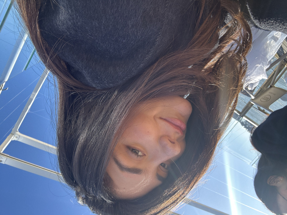 The image presents a selfie-style portrait of a young adult female, positioned diagonally from the upper left to the middle right