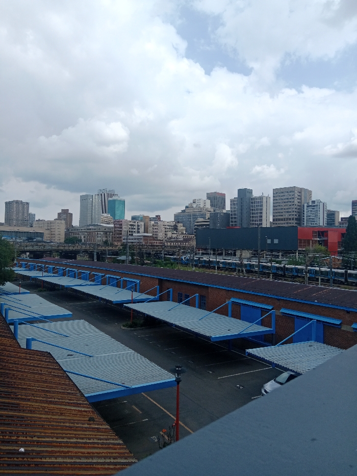 The image presents an elevated urban landscape view of Johannesburg, South Africa, under an overcast sky. In the immediate foreground, a weathered, rusted corrugated metal roof is partially visible at the bottom left. Adjacent to this, a large asphalt parking area occupies the lower midground, featuring multiple rows of carports constructed from light blue/grey corrugated metal roofs supported by blue steel frames and red poles. One white vehicle is partially discernible parked beneath a carport on the right. A single red-orange streetlight pole stands within the parking lot. Behind the parking area, a long, low-rise brick building with a dark roof and multiple blue-framed windows and doors extends horizontally across the scene. Beyond this building, an extensive network of railway tracks is visible, densely packed with numerous parked blue and white passenger train carriages. Overhead electrical lines for the trains crisscross above the tracks. In the background, the dense skyline of the Johannesburg central business district rises. This cityscape comprises numerous multi-story buildings of varying architectural styles, including modern glass skyscrapers and older concrete structures. A prominent railway or road bridge spans across the upper midground, connecting different parts of the urban infrastructure. The overall environment is urban and industrial, dominated by infrastructure and buildings, with no individuals clearly visible.