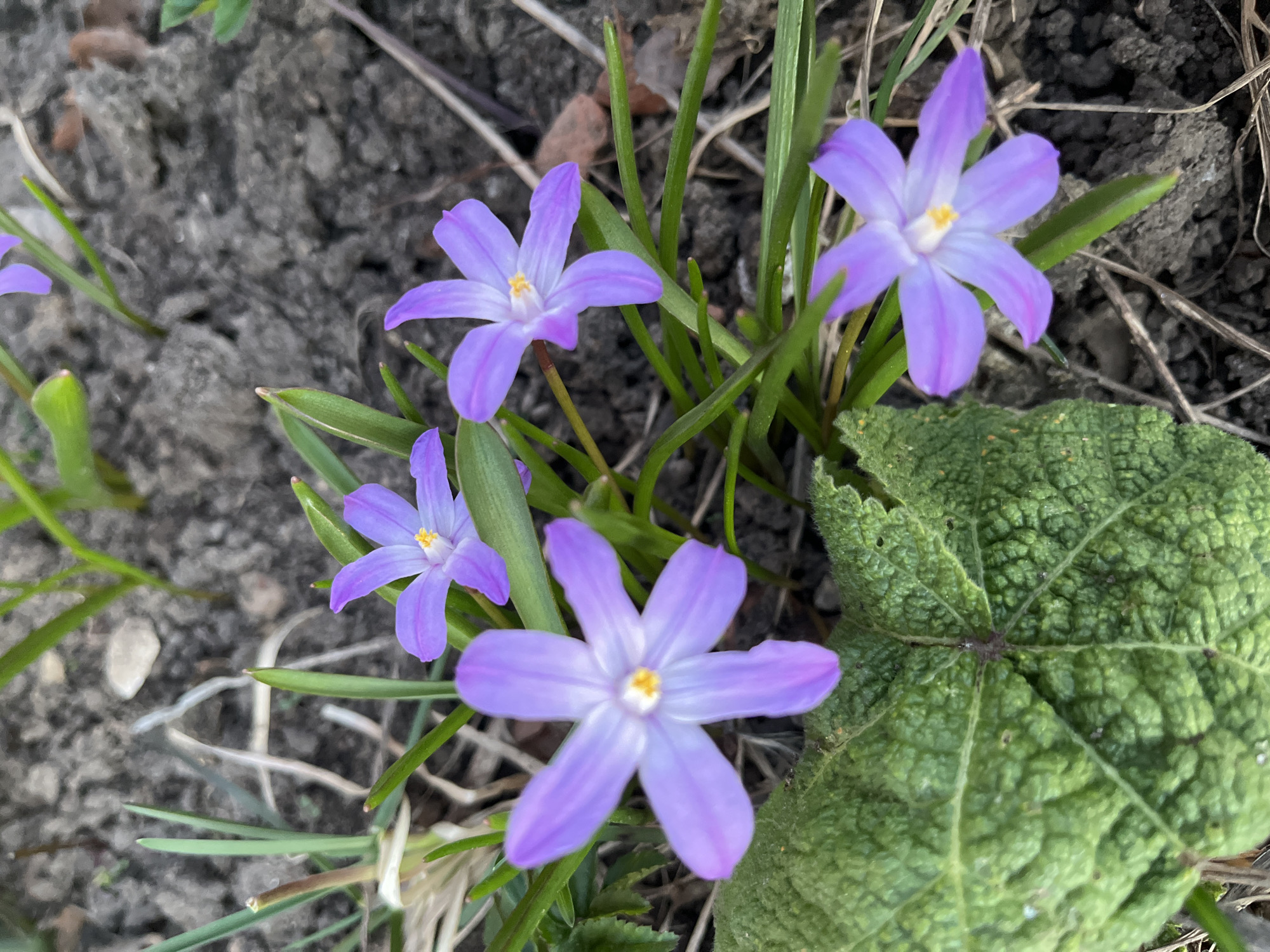 close-up view of four Scilla siberica flowers, also known as Siberian squill. The flowers are light purple with six petals and a yellow center. They are growing among blades of grass and other vegetation. A large, crinkled green leaf is visible on the right side of the image. The flowers are growing in soil. The location is possibly Podolsk, Russia. There are no people or interactions visible in the image.