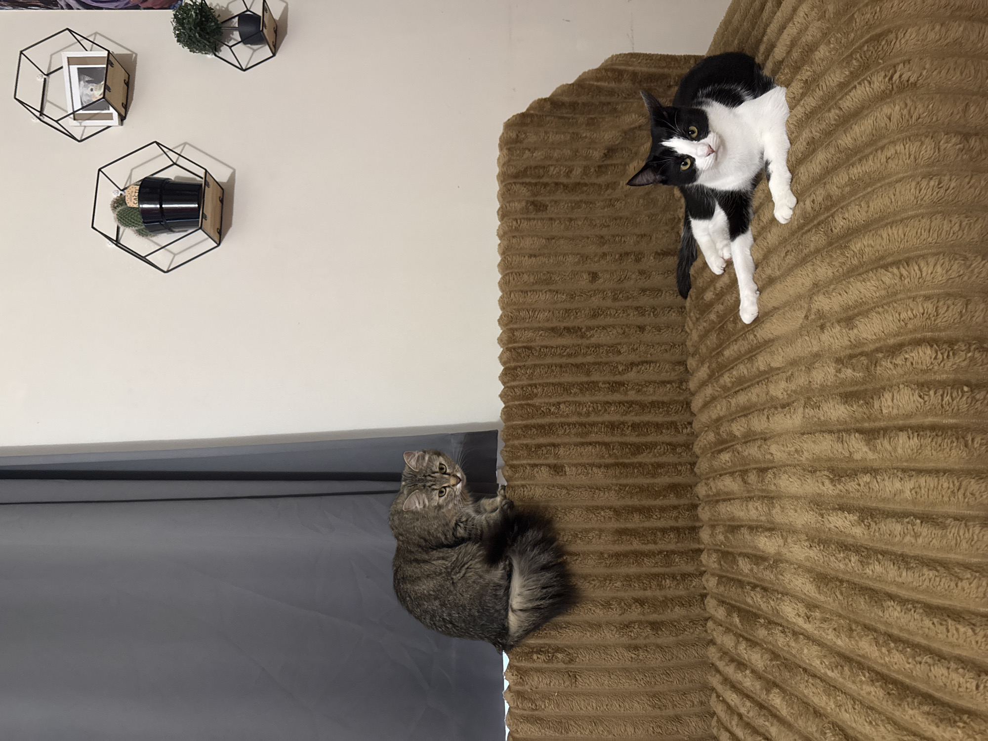 - "A high-angle shot depicts two cats interacting near a cat tree and shelving units" by FM-xL3m02, licensed under CC BY 4.0