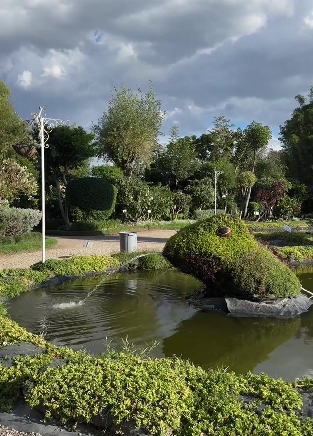 garden with a small pond. The pond is lined with lush green ground cover and features a green, moss-covered structure in the center that resembles a turtle or some other animal form. A small fountain sprays water in the pond. White, decorative lamp posts are visible on the perimeter of the pond near a paved path. Trees and other foliage are present in the background, with a gray trash can in the distance near the path. The sky is partly cloudy, with patches of blue visible. The video is static, with no visible people or significant actions beyond the water fountain.