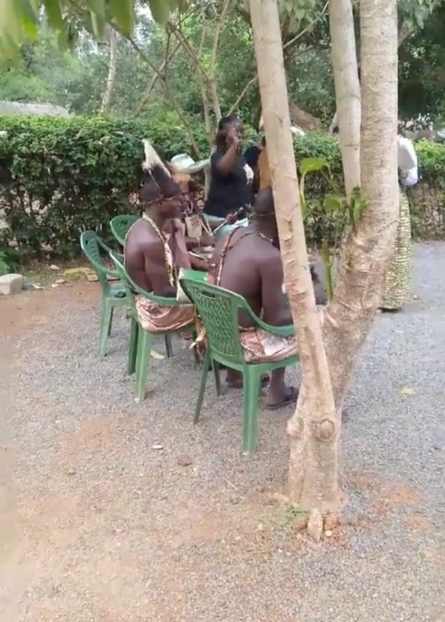 three shirtless men wearing traditional clothing and jewelry sitting in green plastic chairs under a tree. One man has a feathered headdress. A woman in a black shirt stands behind them, apparently attending to them. Another woman in a patterned dress stands in the background to the right. The setting is an outdoor area covered with gravel, with a hedge in the background. The scene seems relaxed and possibly ceremonial.