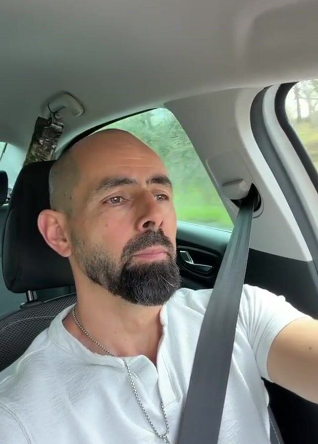 A man with a shaved head and a black and grey beard sits in the driver's seat of a car, wearing a white shirt and a silver chain necklace