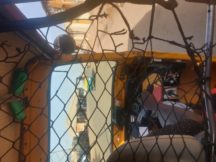 A vehicle's interior is visible through a wire mesh screen. The dashboard, steering wheel, and driver's hands are partially obscured. A side mirror and green pouches are affixed to the vehicle's side. Outside the vehicle, a street scene is visible, including buildings under a bright sky. The vehicle is mostly yellow, with some black and red details.