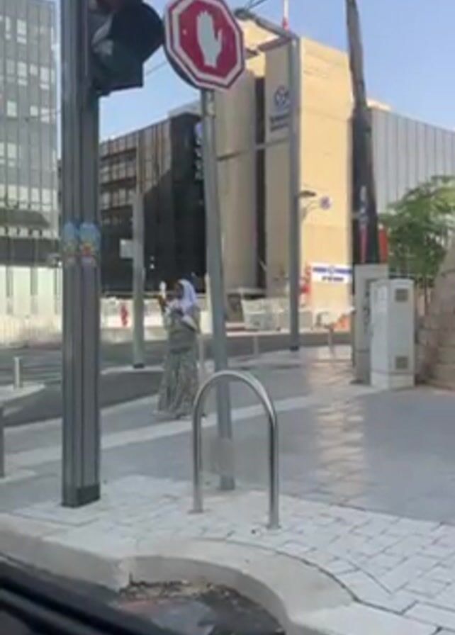 The scene is a street intersection in an urban environment, captured from inside a vehicle. A woman wearing a headscarf and a patterned dress stands on the corner of the crosswalk, possibly looking at her phone. A stop sign and a traffic light showing red are visible next to her. Behind her, there is a modern building with reflective windows and a larger, older building with an emblem on it. A bike rack stands nearby on the sidewalk. The street appears relatively empty with construction or maintenance taking place nearby. The day is sunny with a clear blue sky.