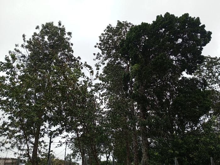 The image depicts a dense cluster of trees under an overcast sky. The trees vary in size and foliage density, with some appearing fuller and darker green than others. The tree trunks are visible, emerging from the undergrowth and leading up to the expansive canopies. Below the trees, glimpses of buildings and fencing indicate an urban or suburban setting. The lighting is muted, highlighting the textures of the leaves and branches.