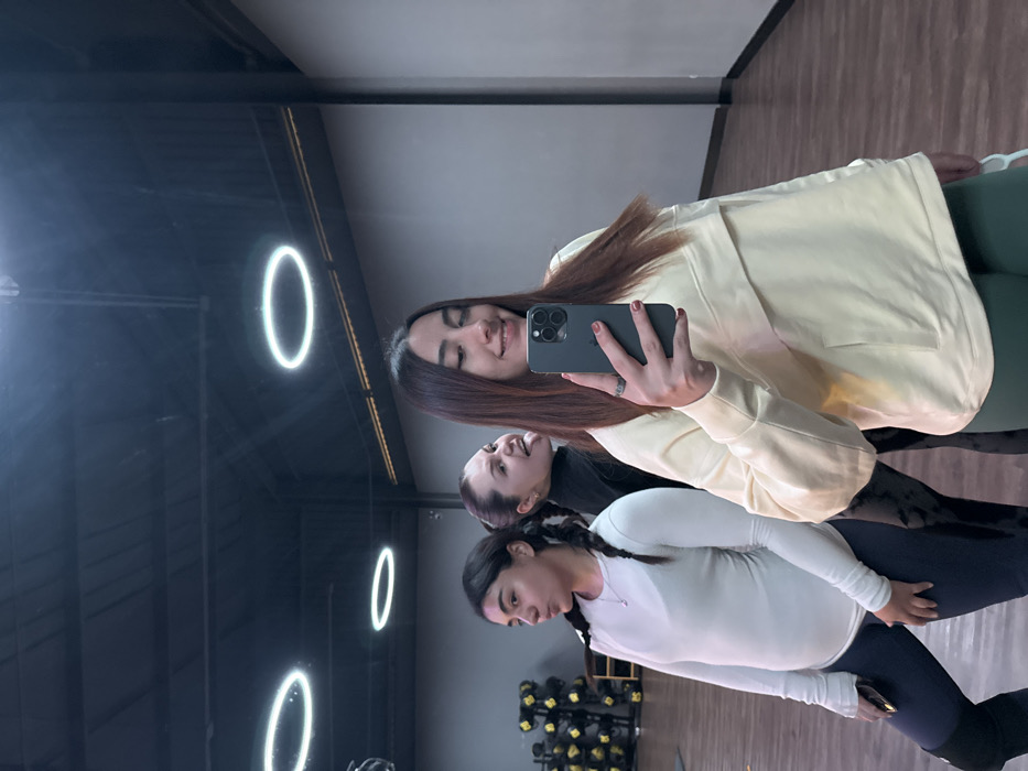 Three adult females are depicted in a mirror selfie taken indoors, in what appears to be a fitness facility located in the city of San Bernardino Tlaxcalancingo, Mexico