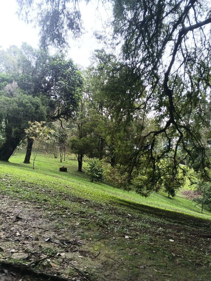 This image depicts a natural, verdant, sloping landscape within the city of Tây Ninh, Vietnam, under an overcast sky. The foreground features dark, moist earth with exposed roots and sparse vegetation, transitioning into a vibrant green, grassy hillside that slopes upwards from left to right. Scattered across the midground hillside are numerous trees of varying sizes and species, all exhibiting dense green foliage. A dark, rectangular object, possibly a concrete block or similar structure, is visible on the grass in the mid-left portion of the slope. The background is dominated by a dense canopy of trees with lush green leaves, suggesting a forested or park-like environment. A large, gnarled tree branch, heavily laden with smaller branches and possibly moss or vines, extends into the frame from the upper right, partially obscuring the view of the sky and distant trees. No individuals or active subjects are present in the scene.