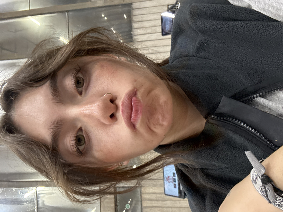A young woman's face, close-up, shows neutral to slightly pursed lips and a nose ring