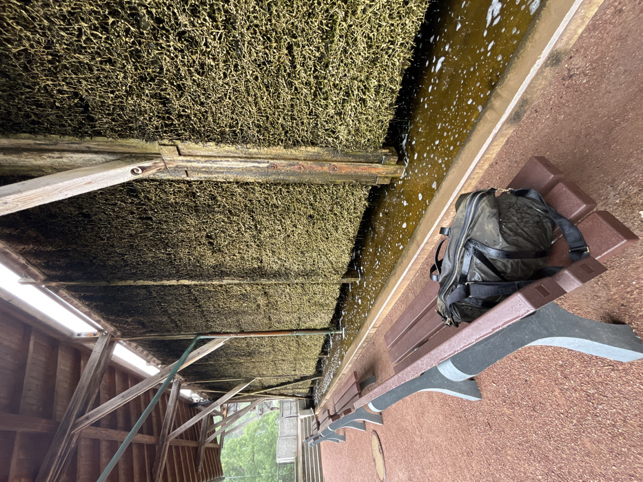 The image depicts an outdoor section of a graduation tower (Salinental) located in Bad Kreuznach, Germany. The foreground consists of reddish-brown gravel ground. Six empty park benches, featuring reddish-brown slatted seats and light grey bases, are arranged in a row extending from the lower center towards the mid-left. A dark green or black duffel bag, appearing to be made of a crinkled fabric, rests on the closest bench. To the right, a large wooden structure forms part of the graduation tower. Its primary feature is a tall vertical wall composed of tightly packed, dark, gnarled brushwood or twig-like material, over which water visibly flows downwards. A trough at the base of this wall contains murky, brownish water with numerous white foam bubbles. The tower structure includes weathered wooden posts and beams, supporting an overhead wooden roof with visible linear light fixtures. A light green horizontal pipe runs above the brushwood wall, below the roofline. In the background, beyond the benches, green trees and light-colored steps are visible. No individuals are present in the scene.