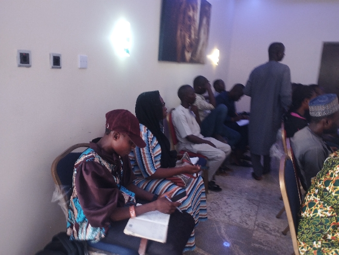 group of people sitting in a room. The room has white walls and a tiled floor. There are three light fixtures on the wall and an oil painting hanging on the wall. The painting depicts a tiger. There are three electrical outlets on the wall. One person is sitting on a chair and writing in a notebook. There are two people sitting on a chair to the left of this person. The person on the far left is wearing a brown shirt with blue accents. The person to their right is wearing a brown and white striped shirt and is looking at the person in the brown shirt. The person sitting in the center is looking down at their notebook. The person on the far right of the image is wearing a green and white patterned robe and is looking forward. There is a man standing to the right of the seated people, wearing a gray robe. There is another group of people in the background to the right of the standing man. They appear to be talking. The room is located in Gombe, Nigeria (latitude: 10.295, longitude: 11.094).