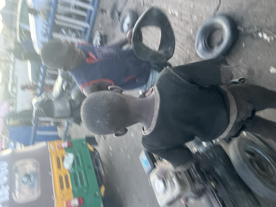 This image depicts an outdoor urban scene in Jos, Nigeria, characterized by activity and various objects. In the foreground, a young boy with dark, short hair is seen from behind, wearing a dark long-sleeved top with lighter trim at the collar and cuffs, and dark trousers. He stands near a small, light-colored engine or generator-like device on wheels, which has a blue cap or handle visible on its top. In the mid-ground, slightly to the right and behind the foreground child, another individual is partially visible, wearing a dark blue sleeveless top with red trim and light-colored bottoms. This person is holding a black, ring-shaped rubber object, resembling a small tire or part of one, and appears to be looking downwards. Several similar black rubber rings or small tires are scattered on the dusty or worn paved ground around this individual. The background is somewhat blurred but reveals further details. To the left, the rear of a brown, yellow, and green three-wheeled vehicle (likely a Keke Napep) is visible. Stretching across the mid-to-far background are blue and white striped metal barriers or fencing. Beyond these barriers, indistinct vehicles, possibly cars or motorcycles, and blurry human figures suggest a bustling environment. The overall lighting is soft, indicative of early morning or late afternoon.
