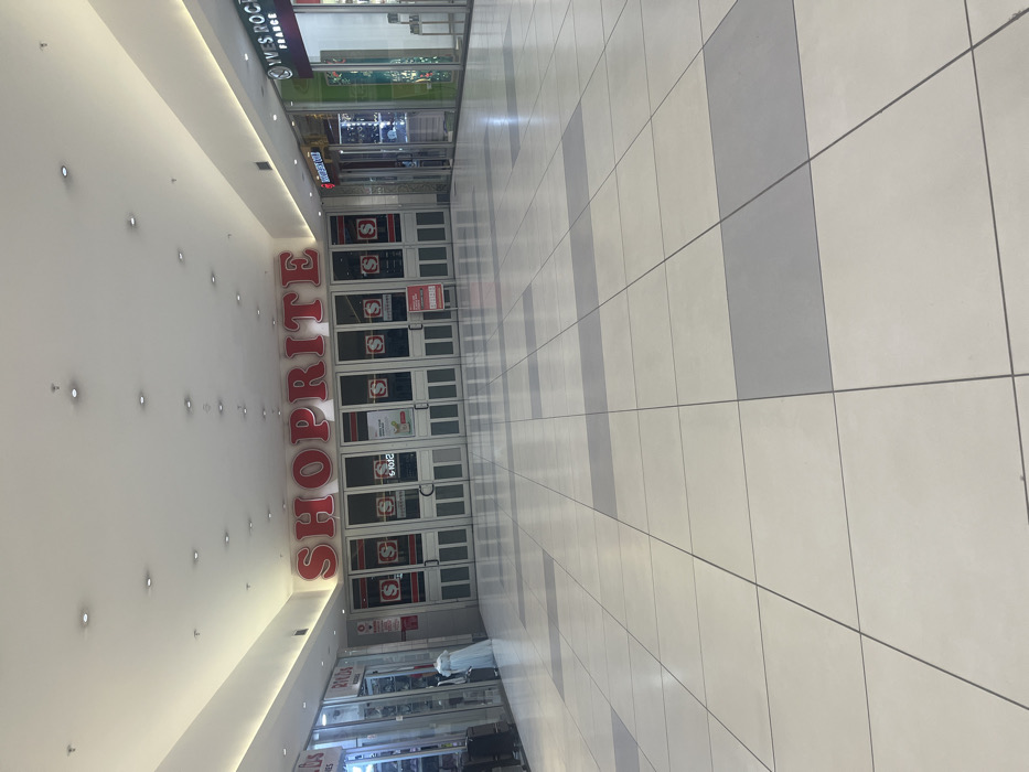 A brightly lit mall hallway features a Shoprite store with multiple closed entrances. A Yves Rocher store is also visible. The hallway has light-colored tiled floors with alternating grey strips. Recessed lighting dots the ceiling. The image is rotated, presenting a tilted perspective.
