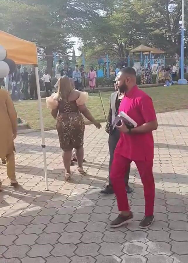person in a gray suit playing a violin in a park. Several people are walking around, including a woman in a brown dress, a man in a pink suit carrying a white book, and a man in a blue patterned shirt. There is a tent with balloons near the people, and a playground is in the background. The ground is paved with gray hexagonal bricks. The sky is blue, and the weather appears sunny.