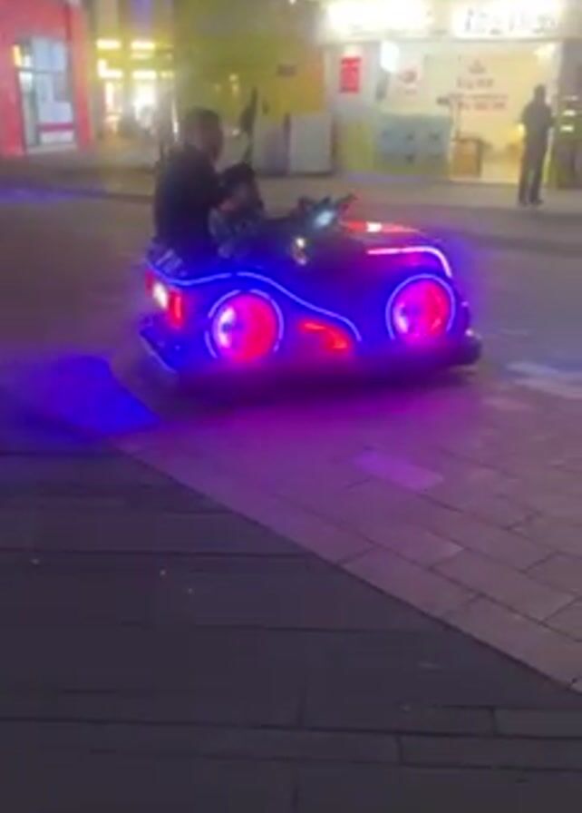 A video captures a scene at night on a city street paved with gray rectangular stones. A small, child-sized, glowing car is in the foreground, occupied by an adult and a child. The car is adorned with bright LED lights that constantly change color, cycling through green, blue, and red. In the background, brightly lit storefronts are visible, and pedestrians are seen walking on the sidewalk. The overall ambiance is vibrant and slightly blurred due to the low light and movement of the car.