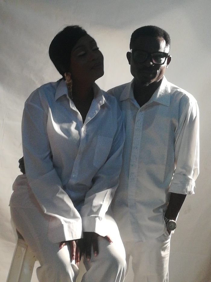 This image depicts two individuals, an adult female and an adult male, posed in an undetermined indoor studio location against a light-colored, plain backdrop