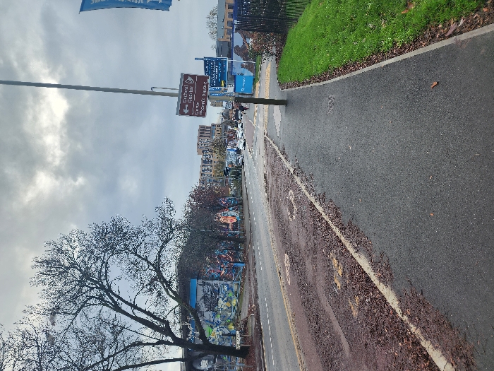 The image depicts an urban street scene under an overcast sky in Leicester, United Kingdom, specifically near the entrance to the city's Cultural Quarter, likely along St George's Way. The viewpoint is from a paved footpath on the right side of the road, looking forward in the direction of travel. The footpath is composed of dark grey asphalt, clean in the foreground, and bordered by a concrete curb. To the right of the footpath is a strip of neatly mown green grass, beyond which a black metal fence runs parallel to the path. Further along the footpath, yellow tactile paving is visible, indicating a crossing point. To the left of the footpath is the main road, also paved with dark grey asphalt. It appears to be a multi-lane thoroughfare. The lane immediately adjacent to the footpath is a dedicated cycle lane, distinguishable by its reddish-brown surface and faded yellow bicycle symbols, partially obscured by a dense accumulation of fallen brown deciduous leaves. White dashed lines mark the separation between the cycle lane and what appears to be another traffic lane further to the left. On the left side of the road, beyond a row of bare-branched deciduous trees, a large building facade is visible, extensively covered in vibrant, multi-coloured graffiti murals. The murals feature complex designs and patterns in shades of blue, green, orange, and white. Behind these trees and murals, distant multi-story buildings, likely residential or commercial, can be seen under the grey sky. In the mid-ground, a tall, slender grey street light pole stands on the right side of the road. Attached to this pole is a brown directional sign with white text, pointing to the left, indicating "Cultural Quarter" and "CURVE THEATRE ATHENA SQUARE." Beyond this sign, on the far right, a blue banner is partially visible. Several vehicles, including a white van and other light-coloured cars, are visible in the distance on the main road, travelling away from the viewer. Indistinct figures, likely pedestrians or cyclists, are present in the far distance near the road, but no clear details are discernible. The overall impression is an urban environment, transitioning into a cultural district, likely in late autumn or winter given the bare trees and fallen leaves.